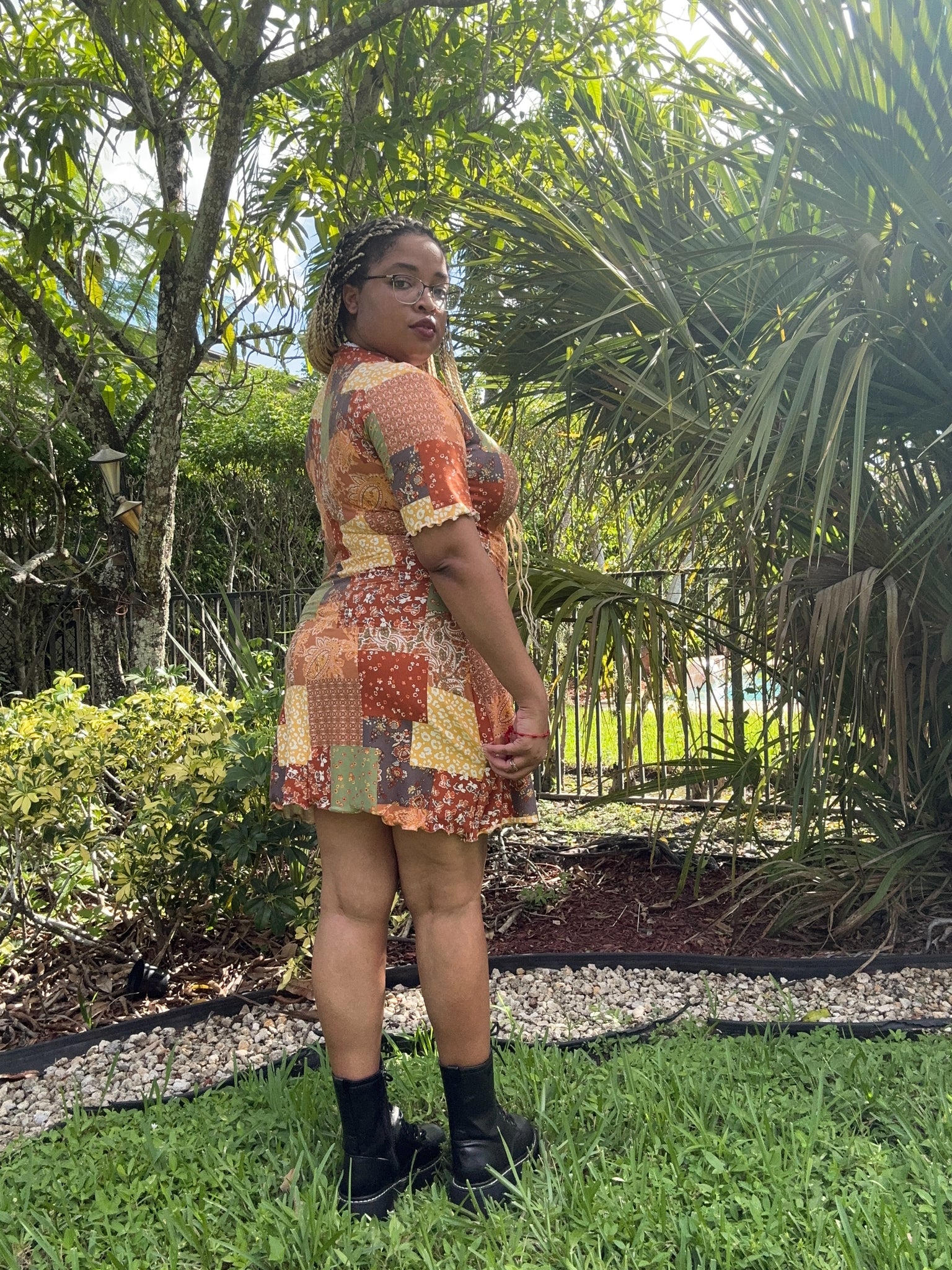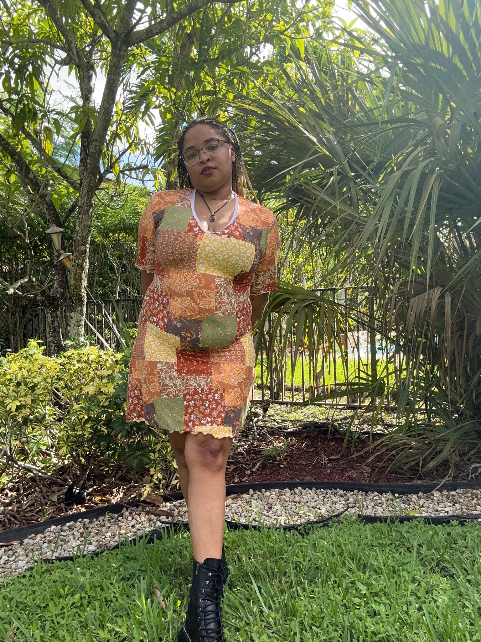 A patchwork-inspired dress in autumn tones of maple, olive, and golden yellow. Lightweight stretch for everyday wear, with a playful mini length. Effortless, cozy, and made for crisp fall afternoons. A nostalgic autumn piece that feels like wrapping yourself in fall leaves.